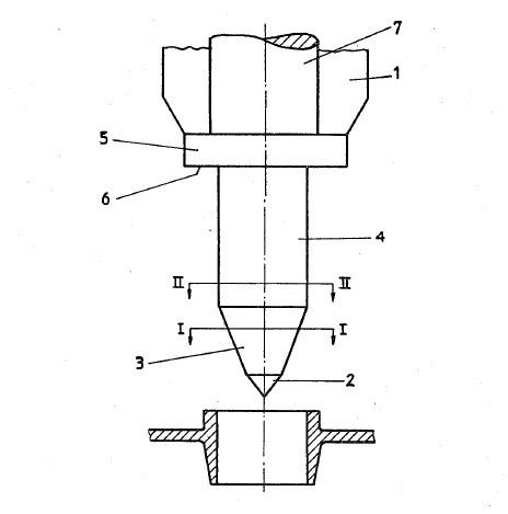1. A flow drill for the production, substantially by heat and pressure of a hole surrounded by a collar in metal sheet or metal tube walls, comprising a shaft having a smooth taperingoperative end being based on a regular polygon and having a cross section defined by a continuous convex contour, situated within the circle circumscribing the polygon, and consisting of a complex harmonic curve obtained by the formula: ##EQU3## in whichthe condition applies to the solutions for R (φ) where: ##EQU4## in which R=the radius factor from the drill center, RO =radius vector in a starting point of the contour in one of the apexes of the polygon, φ=the angle between R and RO,e=Rmax -Rmin, n is the number of apexes of the polygen, δ is a modulation factor and α is a non-symmetry factor.