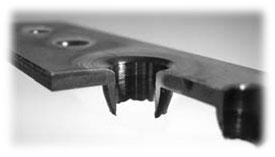 平口型熱熔鉆(刮平型熱熔鉆):熱熔鉆頭的中間臺階部分磨有銑刀刃口,熱熔鉆穿透工件拉伸形成襯套的同時把工件表面凸環切掉(銑平并倒角) ,使工件表面平滑