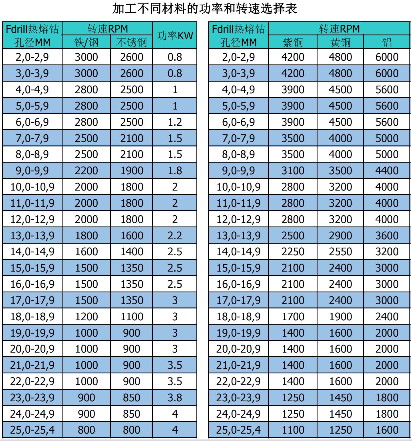 熱熔鉆加工不同材料的功率和轉(zhuǎn)速選擇表